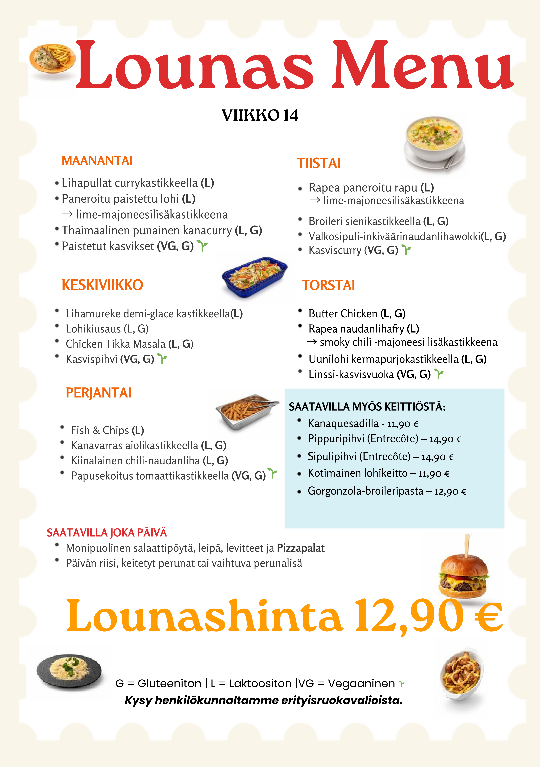 Annokset sisältävät valitsemasi lisukkeen: Ranskalaiset, lohkoperunat,